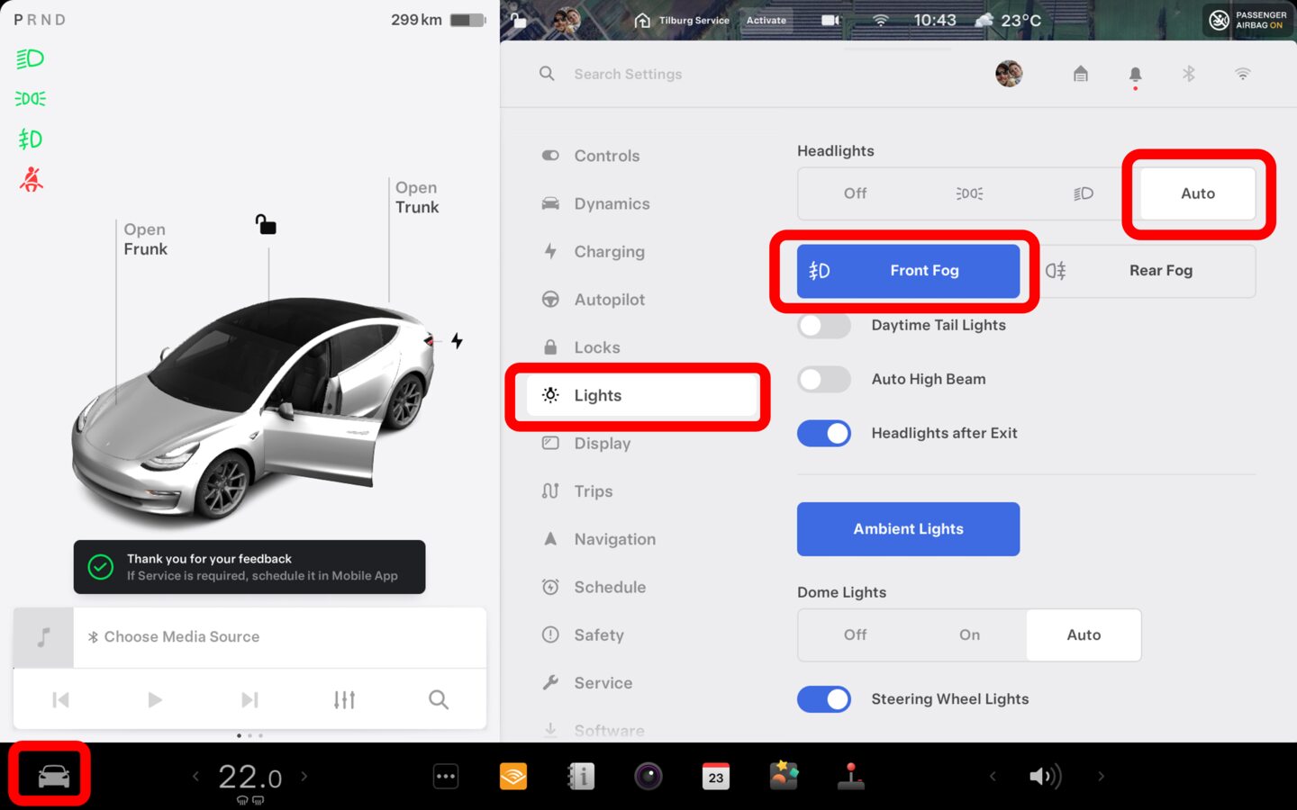 注Select Controls > Lights > Front Fog. Make sure that the vehicle is on and exterior lights are in "On" or "Auto".