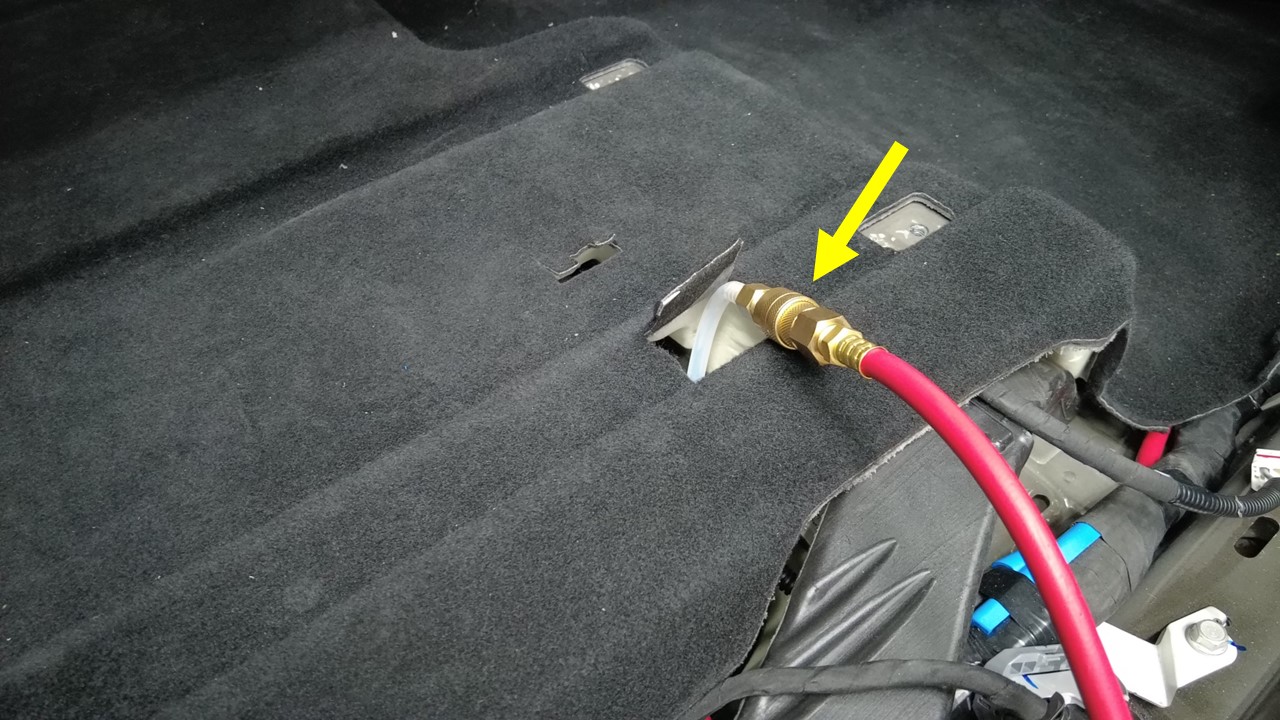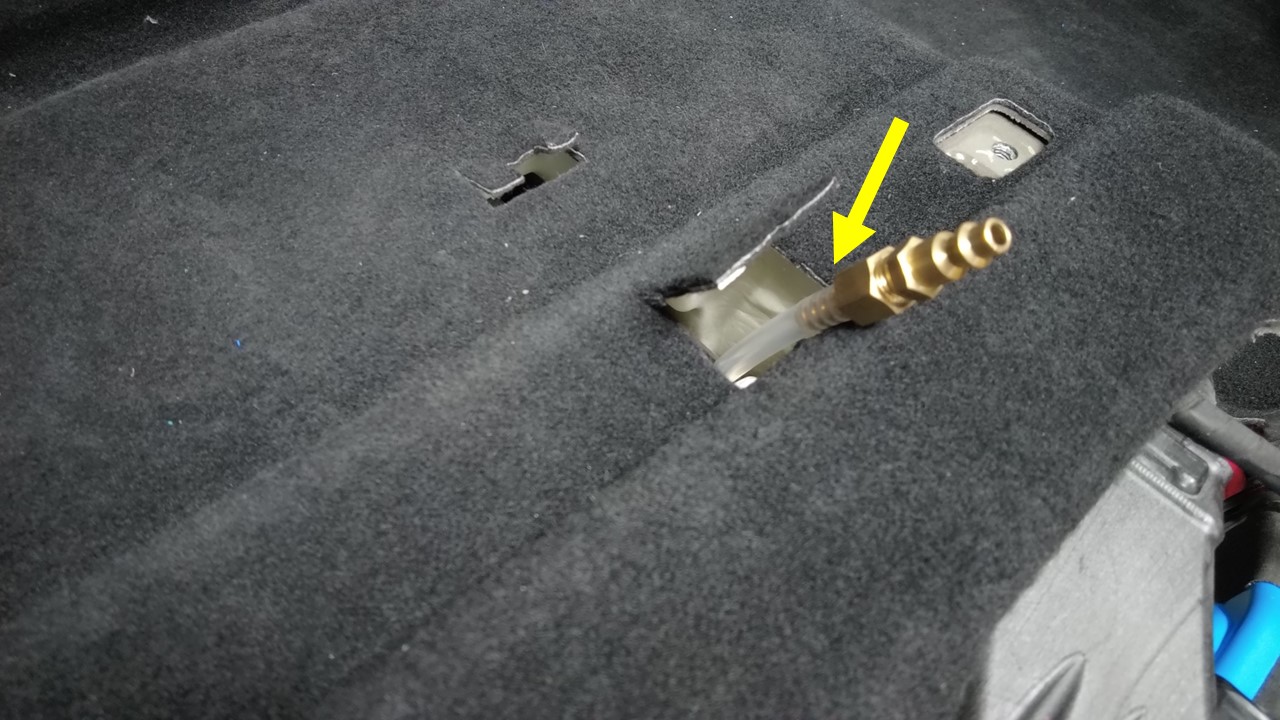 分离第二排右侧座椅下方的地毯开孔,以接触直通型组合通气孔,必要时可进行扩孔。