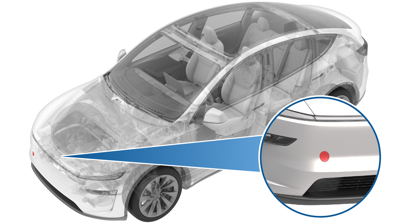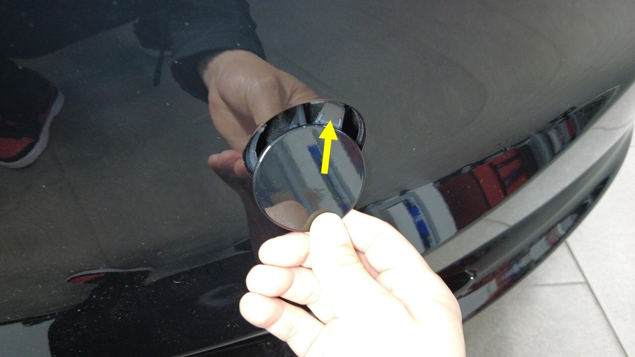 将左右拇指分别放在 1 点钟和 2 点钟位置,并将指节放在保险杠饰板表面,以支撑手部。左右拇指在盖板外边缘用力,直至盖板向内旋转,然后轻轻将升起部位拉向自己。