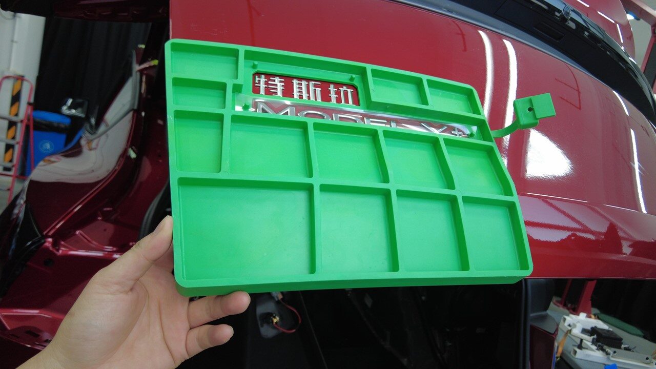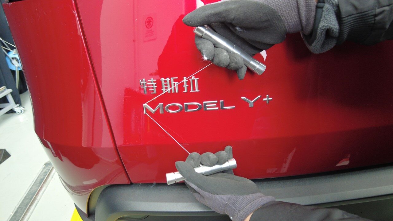 关闭掀背尾门,将保护膜重新置于徽标上,使用滚压机 (1049517-00-A) 彻底压实徽标,然后揭下保护膜。