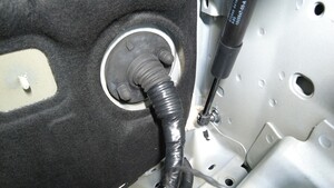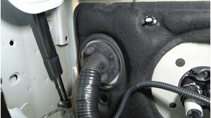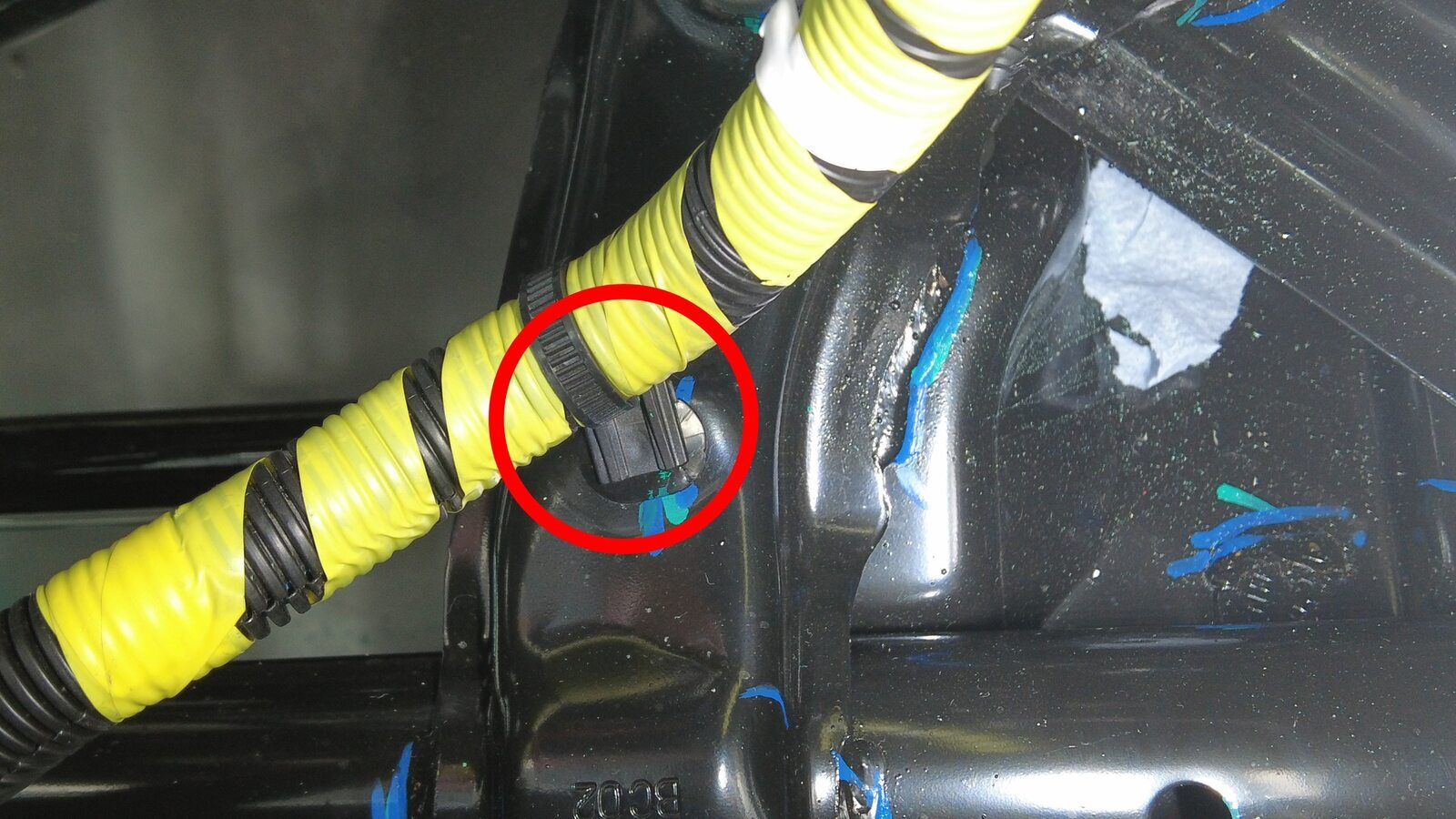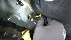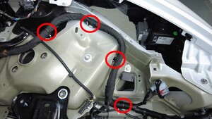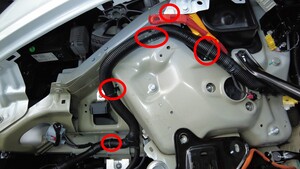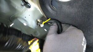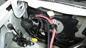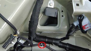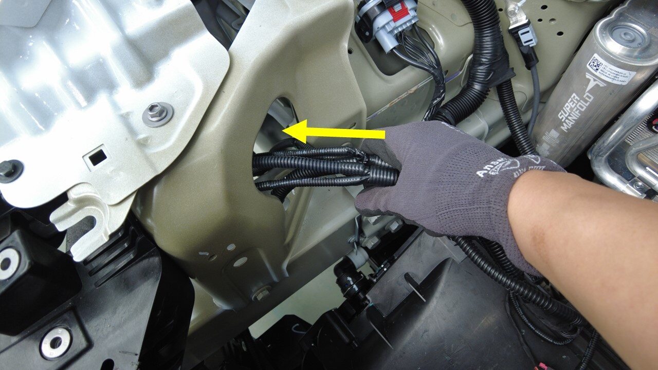 将主前线束右侧穿过右侧减震塔封闭板布设好。
