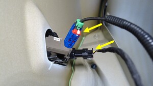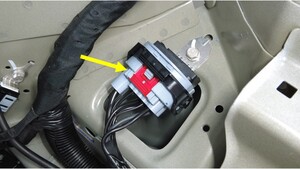 松开连接器锁,然后断开右侧行人保护传动装置连接器。
