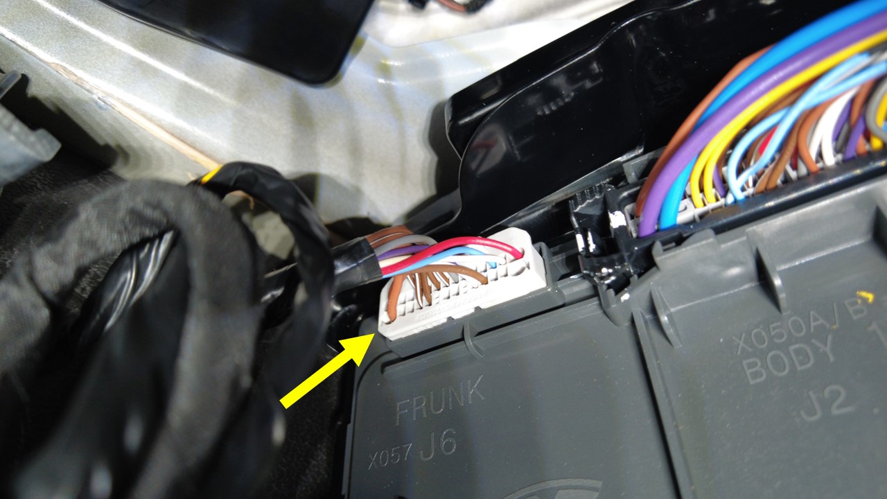 将 J6 前备箱储物单元电气连接器连接到右侧车身控制器模块。