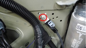 连接前部线束接地端子连接器(位于右前减震塔处)。