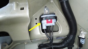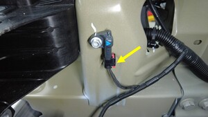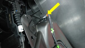 连接前部线束接地端子连接器(位于左前减震塔处)。
