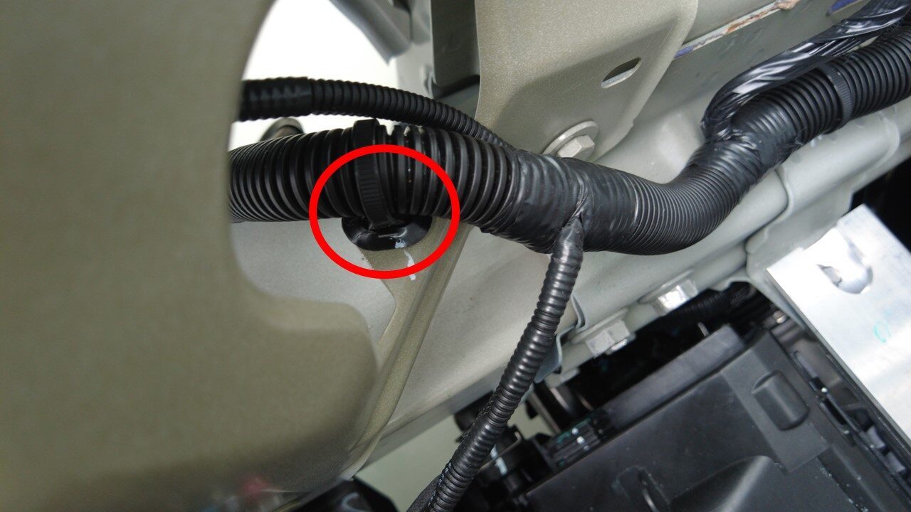 将索环推过左侧隔板,然后将前部线束左侧穿过左侧隔板移入。