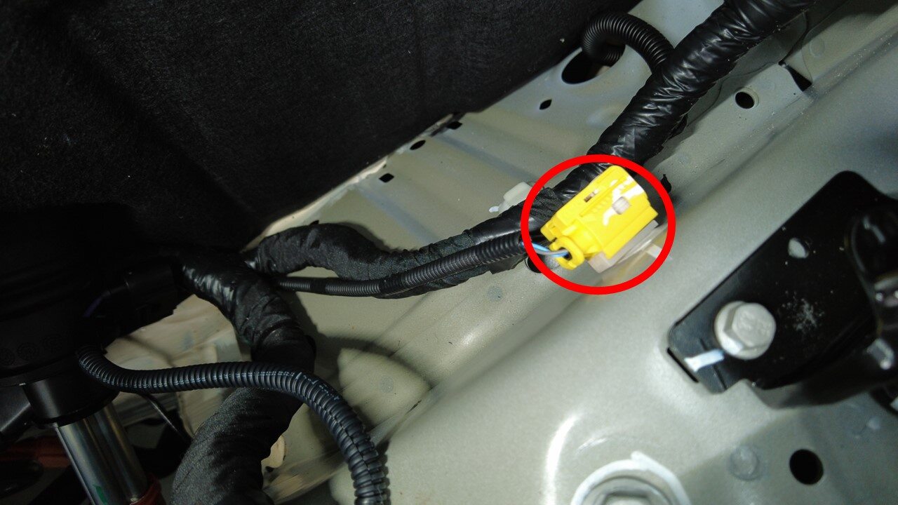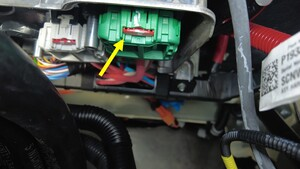 松开连接器锁片,然后断开左前支柱塔附近的高压互锁回路连接器。