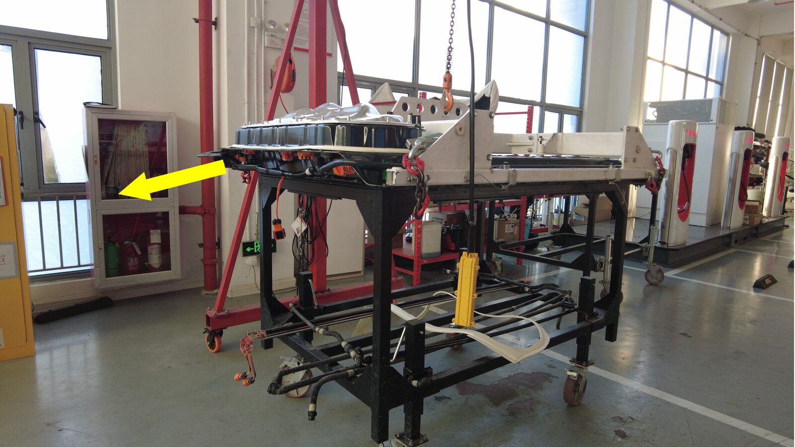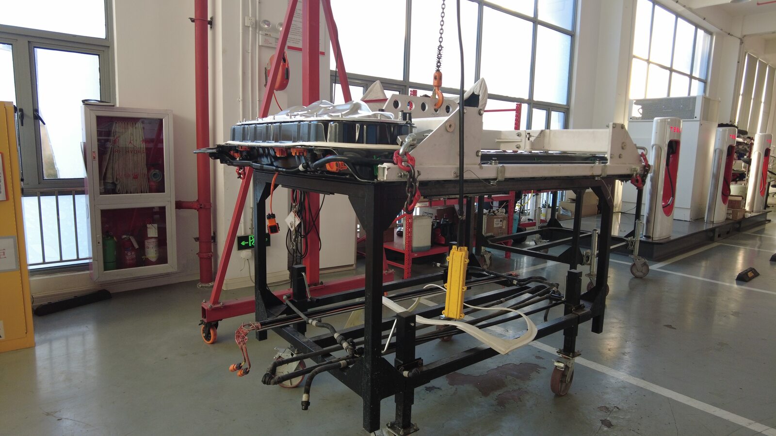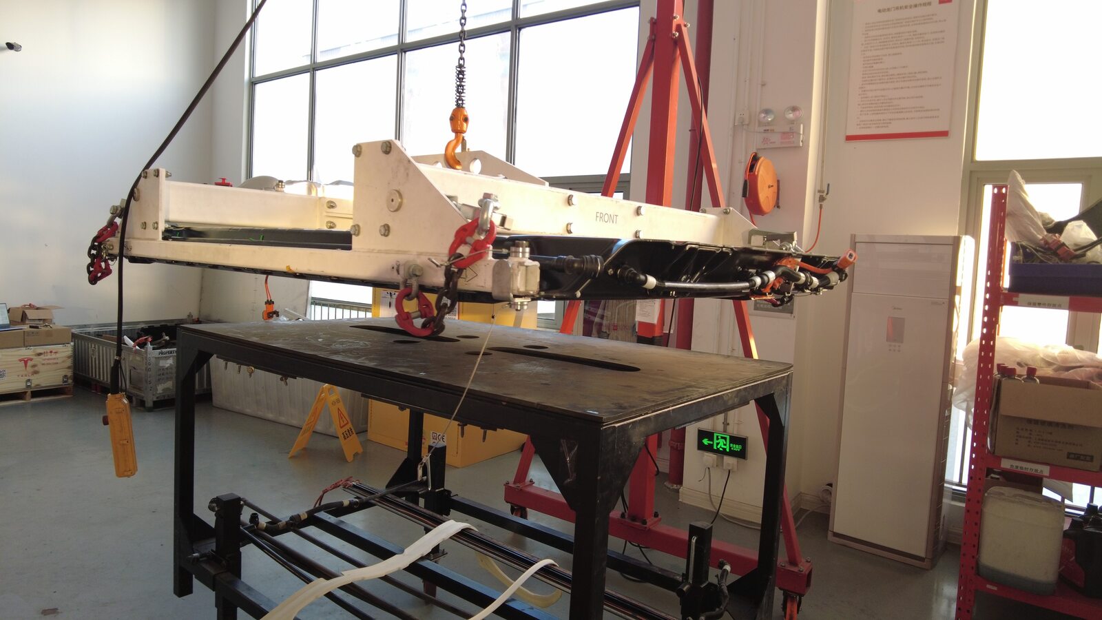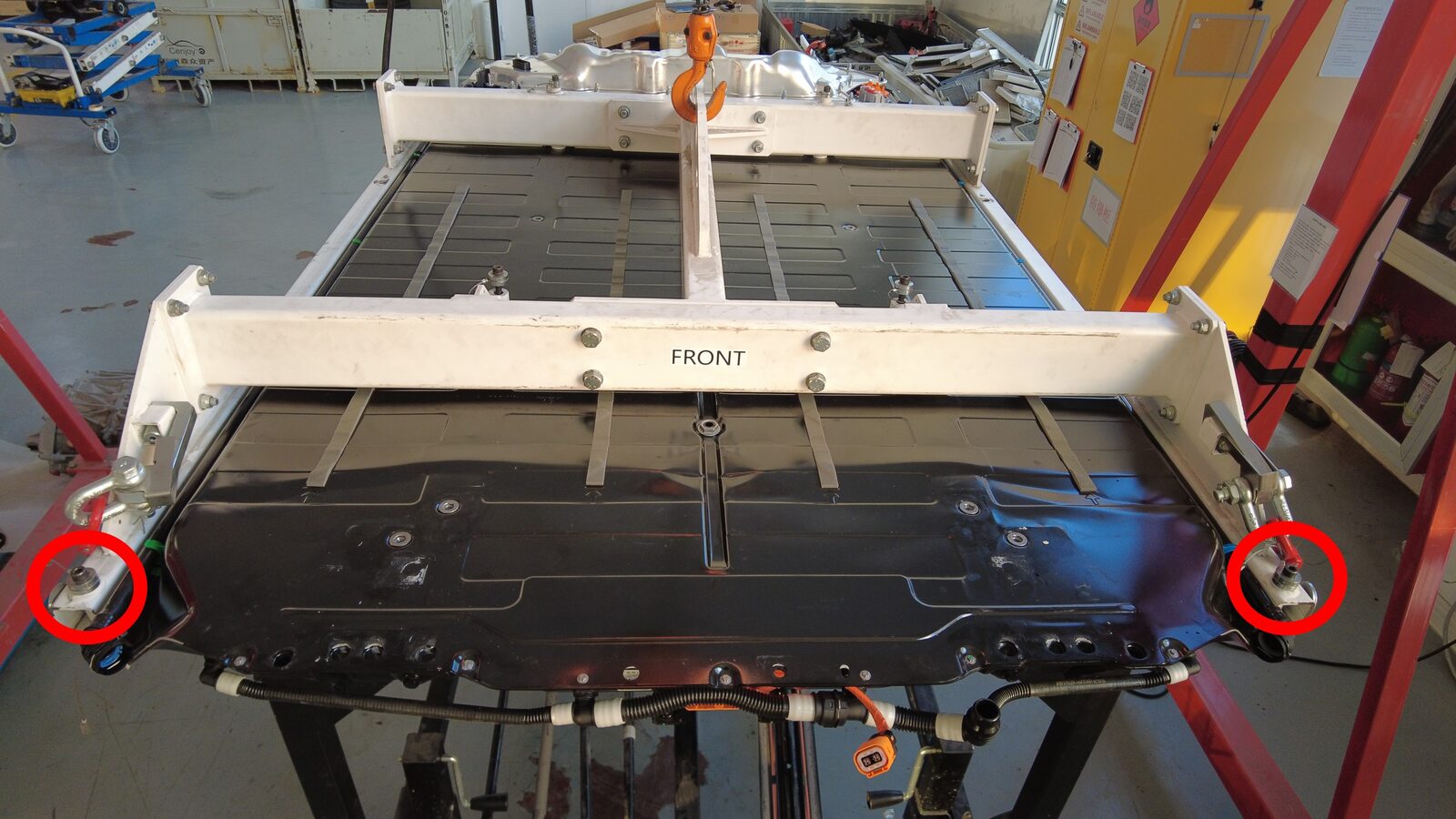 Position the gantry over the new HV battery crate and secure the H-frame to the battery.