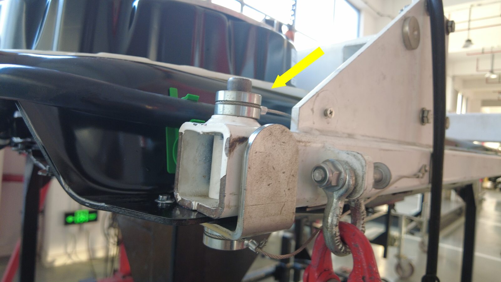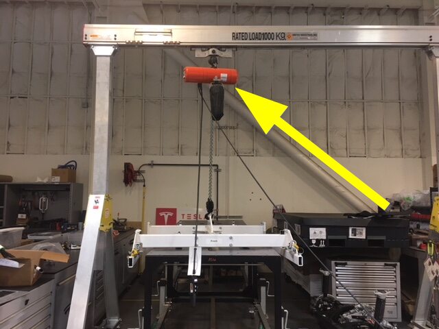 Attach HV battery H-frame to the gantry and raise it into position.
