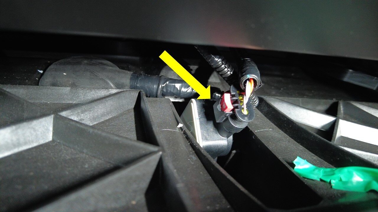 小心地将环境温度传感器盖板从主动进气格栅上拆下,然后将连接器穿过开口移出。