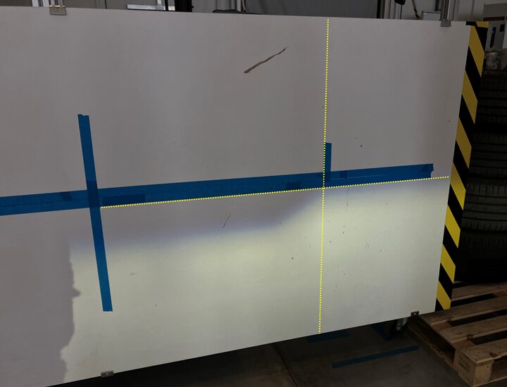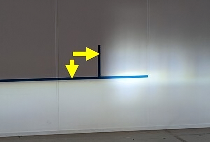 调整右侧前照灯:点击触摸屏上的Right,然后使用方向盘左滚轮调整光束水平。调整右侧前照灯,使水平光束顶部与墙壁上的水平胶带标记对齐,且 "L" 型光束的左边缘与左侧垂直参考胶带标记对齐。