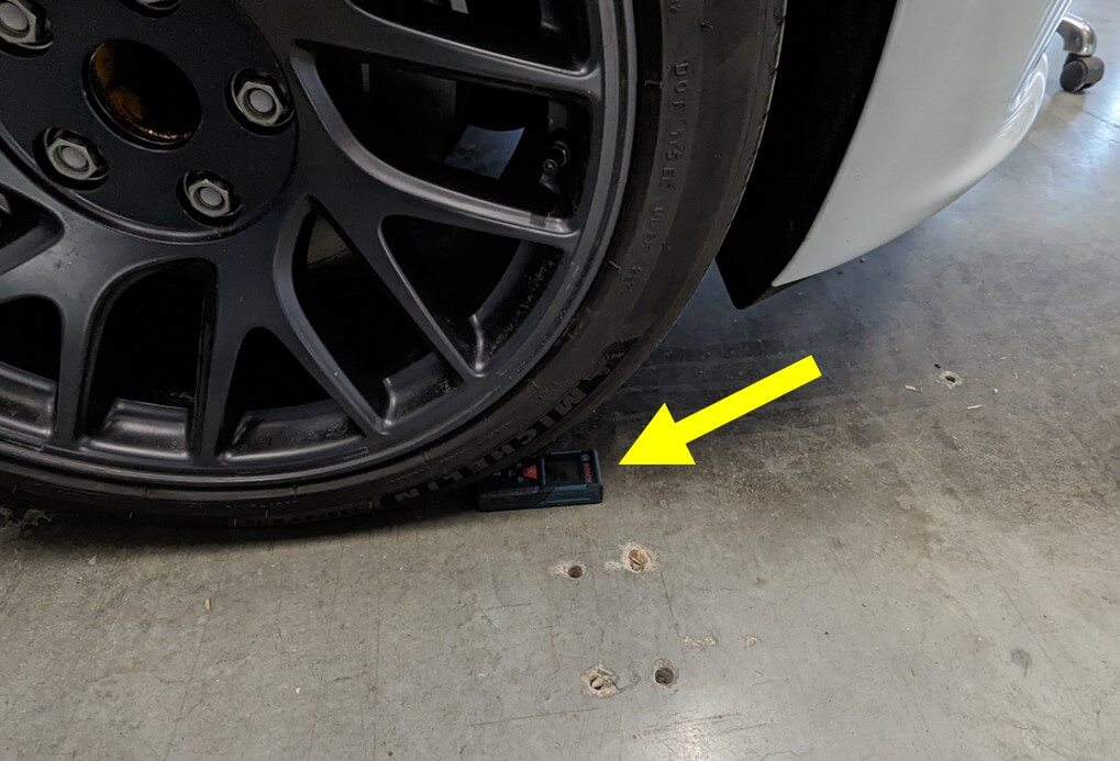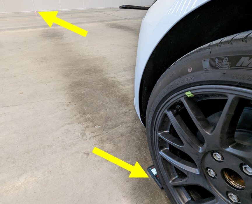 测量从两个前轮毂中心到墙壁的距离。