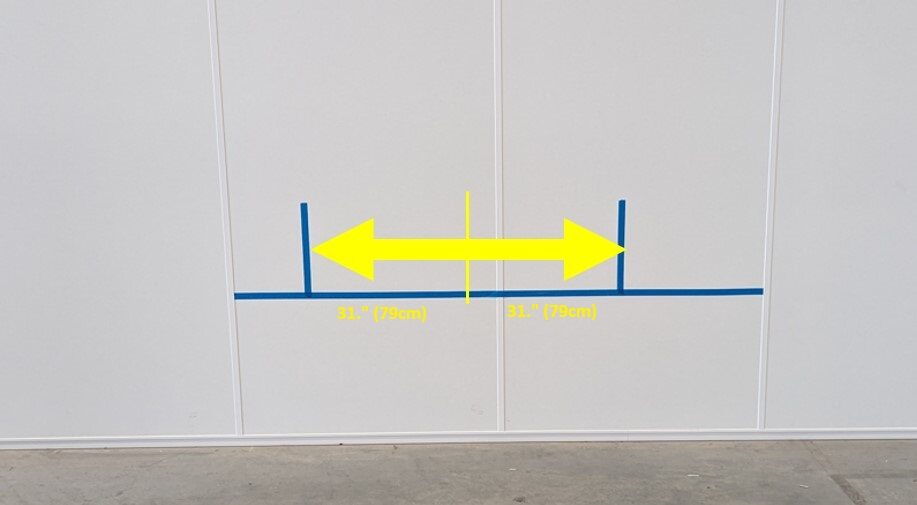 在墙壁上距离中心线 77 厘米(30 英寸)处做垂直标记:在中心线两侧垂直粘贴胶带。