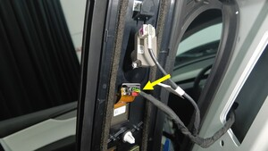 将摄像头连接器和 NFC 连接器连接到 B 柱饰板,然后将 B 柱饰板放置在车辆上。