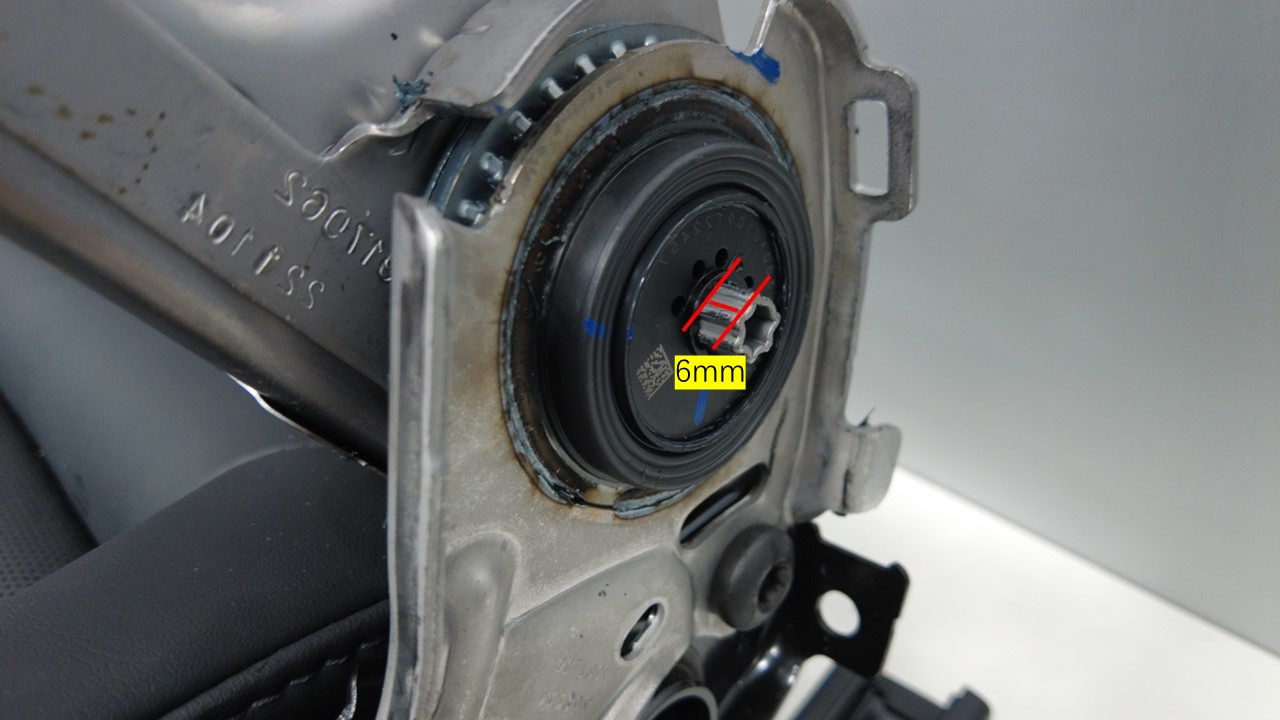 将驾驶位座椅靠背倾角调节管从驾驶位座椅总成内侧推入,然后将靠背倾角调节管推入座椅框架,直到大约 6 毫米调节管可以从外侧看见为止。