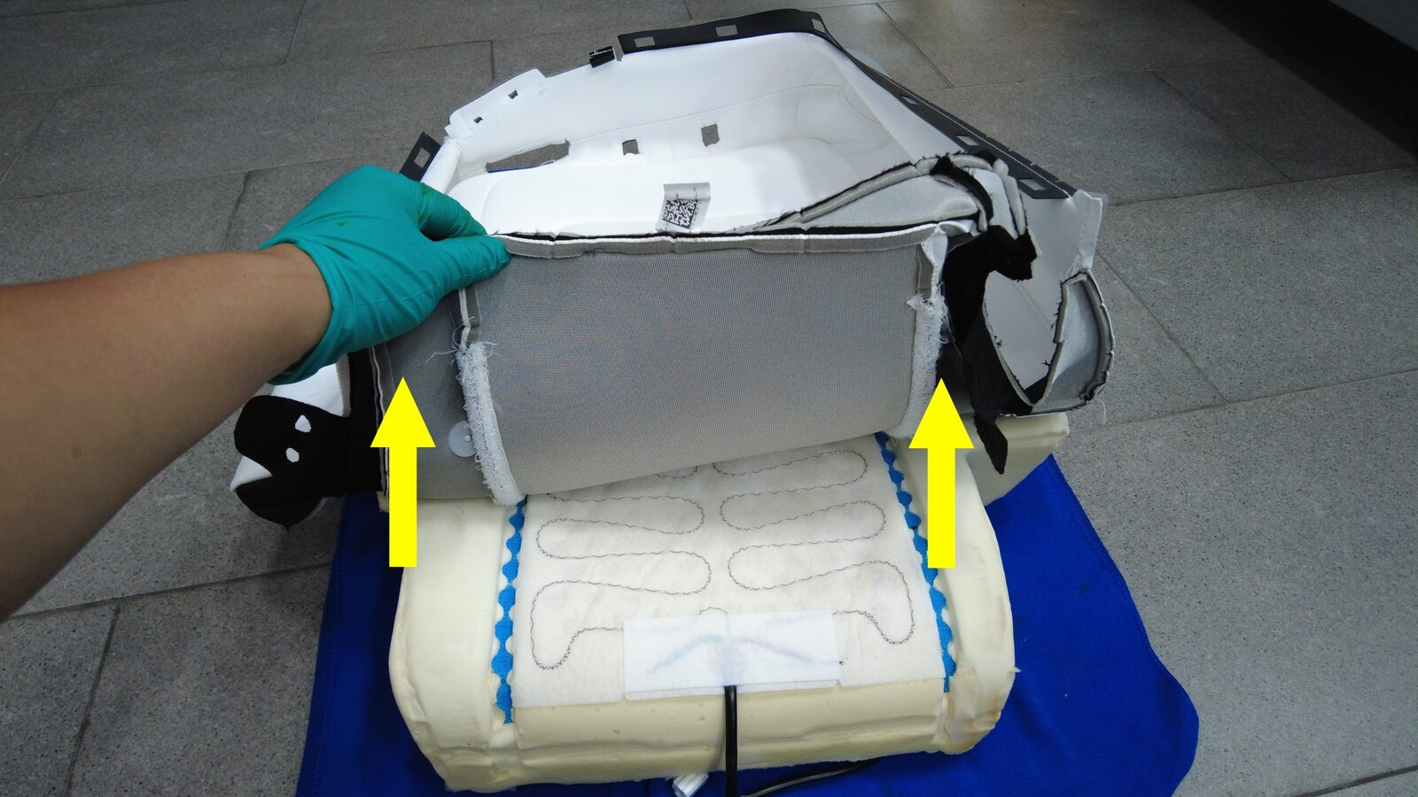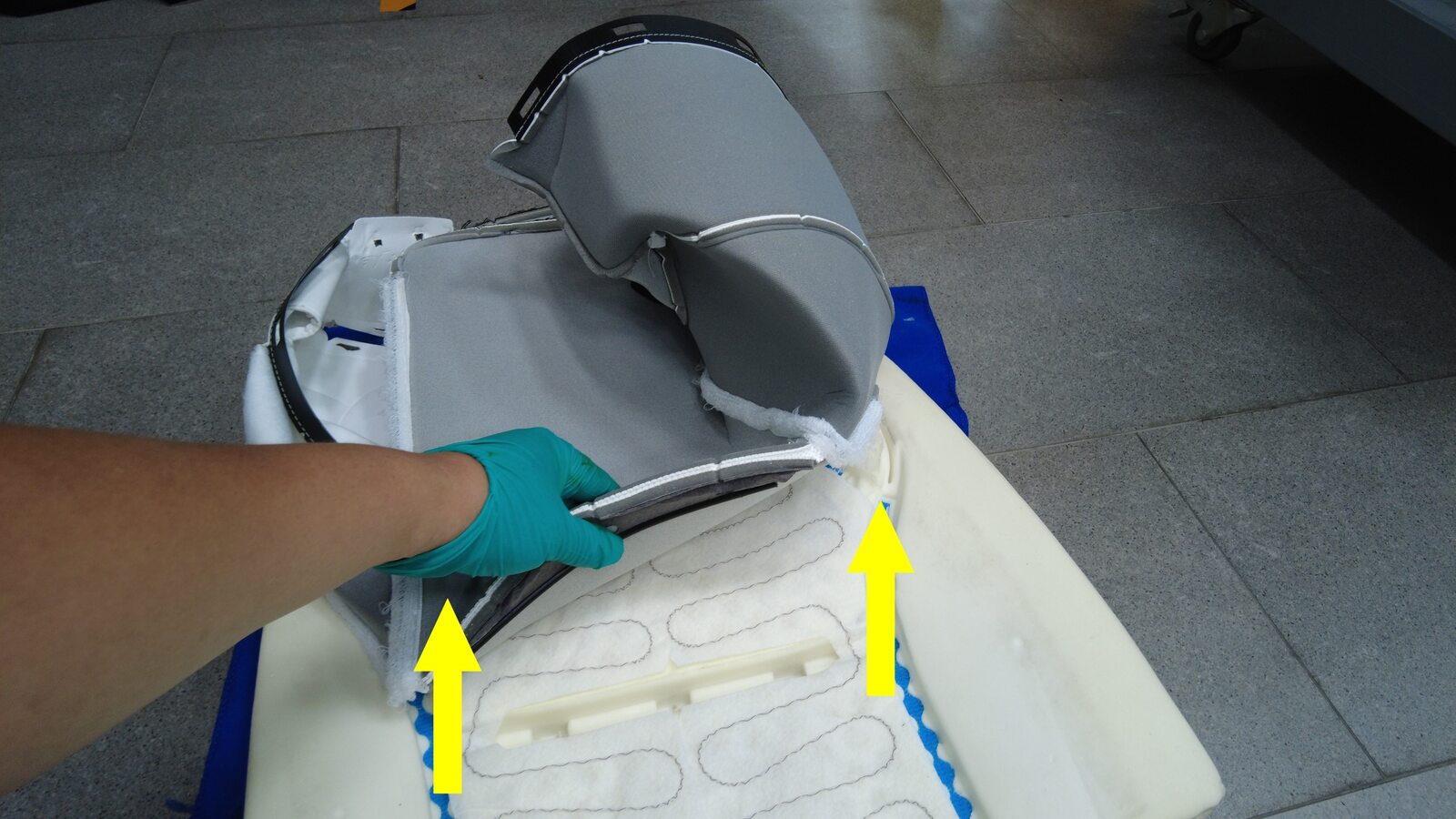 将座椅安全带穿过蒙皮罩,然后将外罩从泡沫垫上拆下。