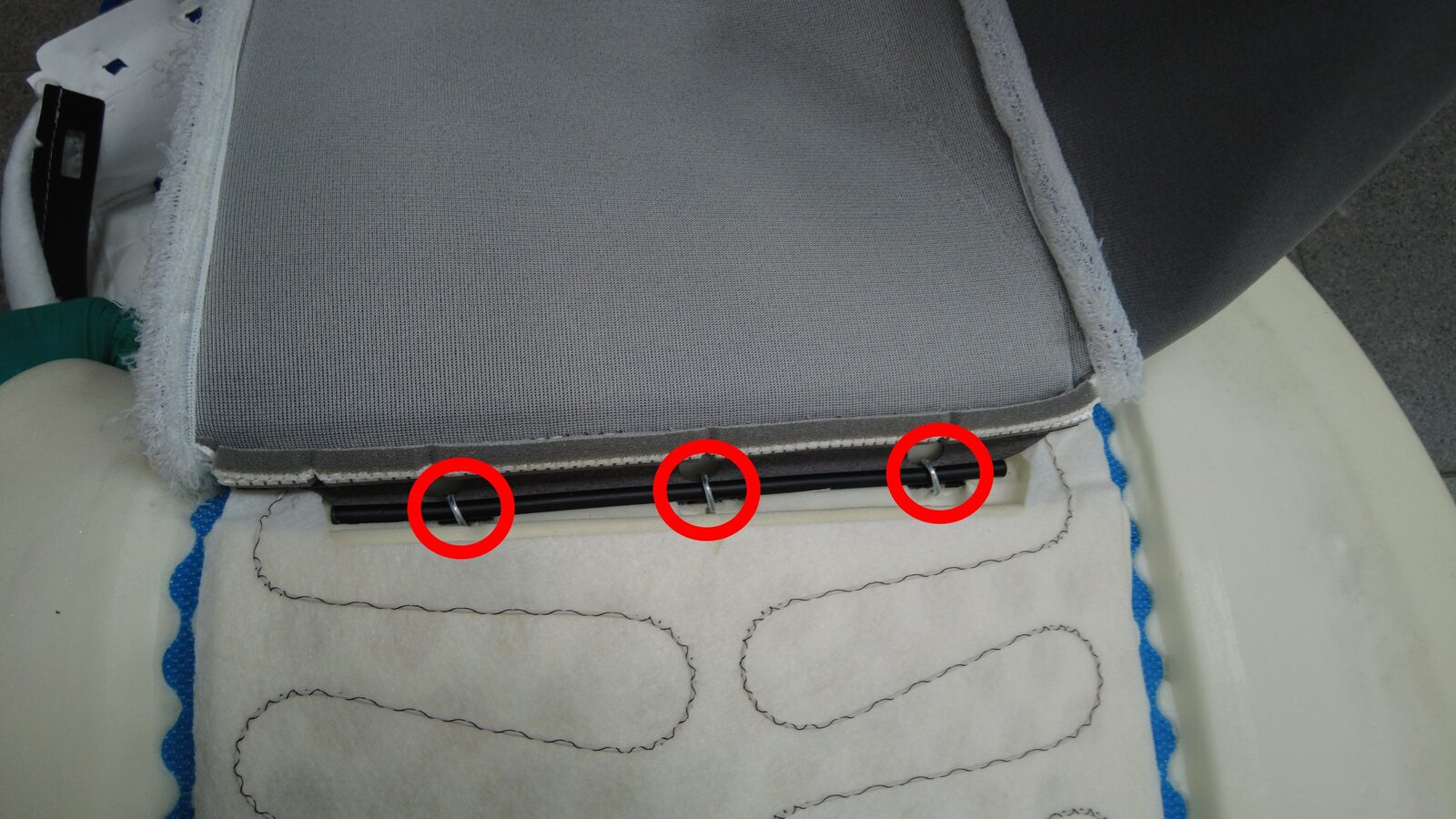 使用拱环钳将新拱环 (1566544-00-A) (3 个)压接到位于座椅靠背中央的第二排左侧座椅靠背蒙皮罩上。