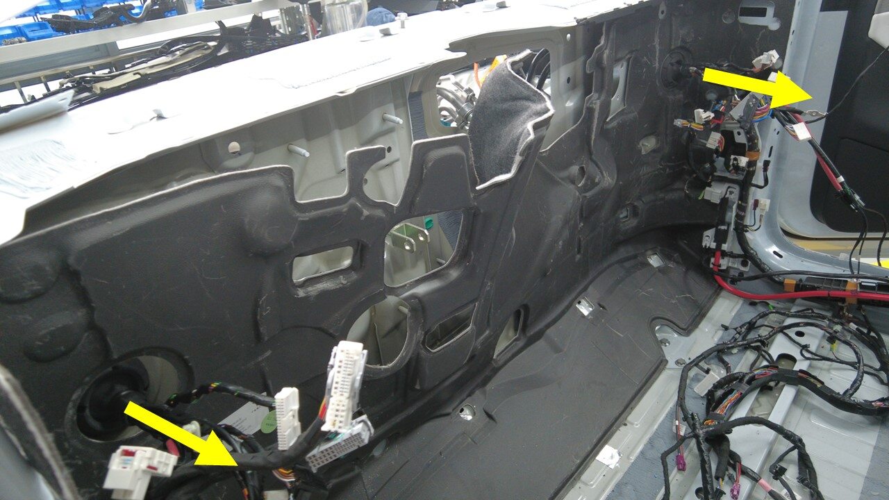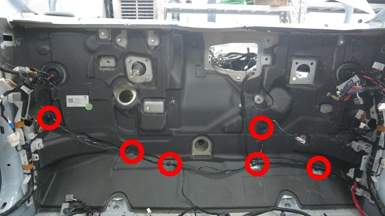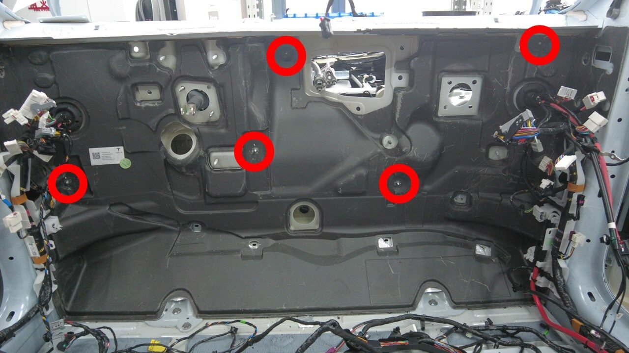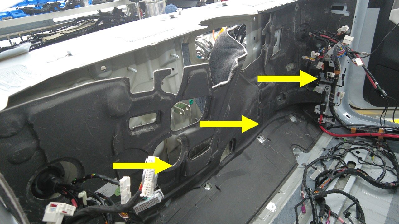 注请留意定位销(5 个)。松开前围板绝缘体两侧的前部车身线束。