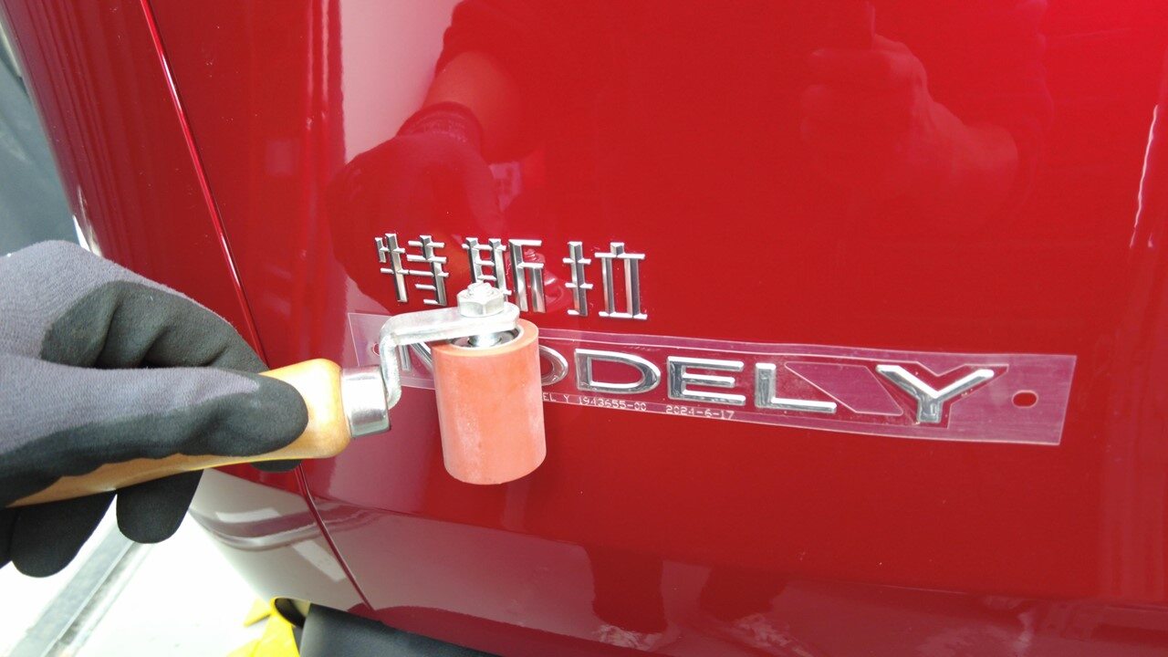 关闭掀背尾门,将保护膜重新置于徽标上,使用滚压机 (1049517-00-A) 彻底压实徽标,然后揭下保护膜。