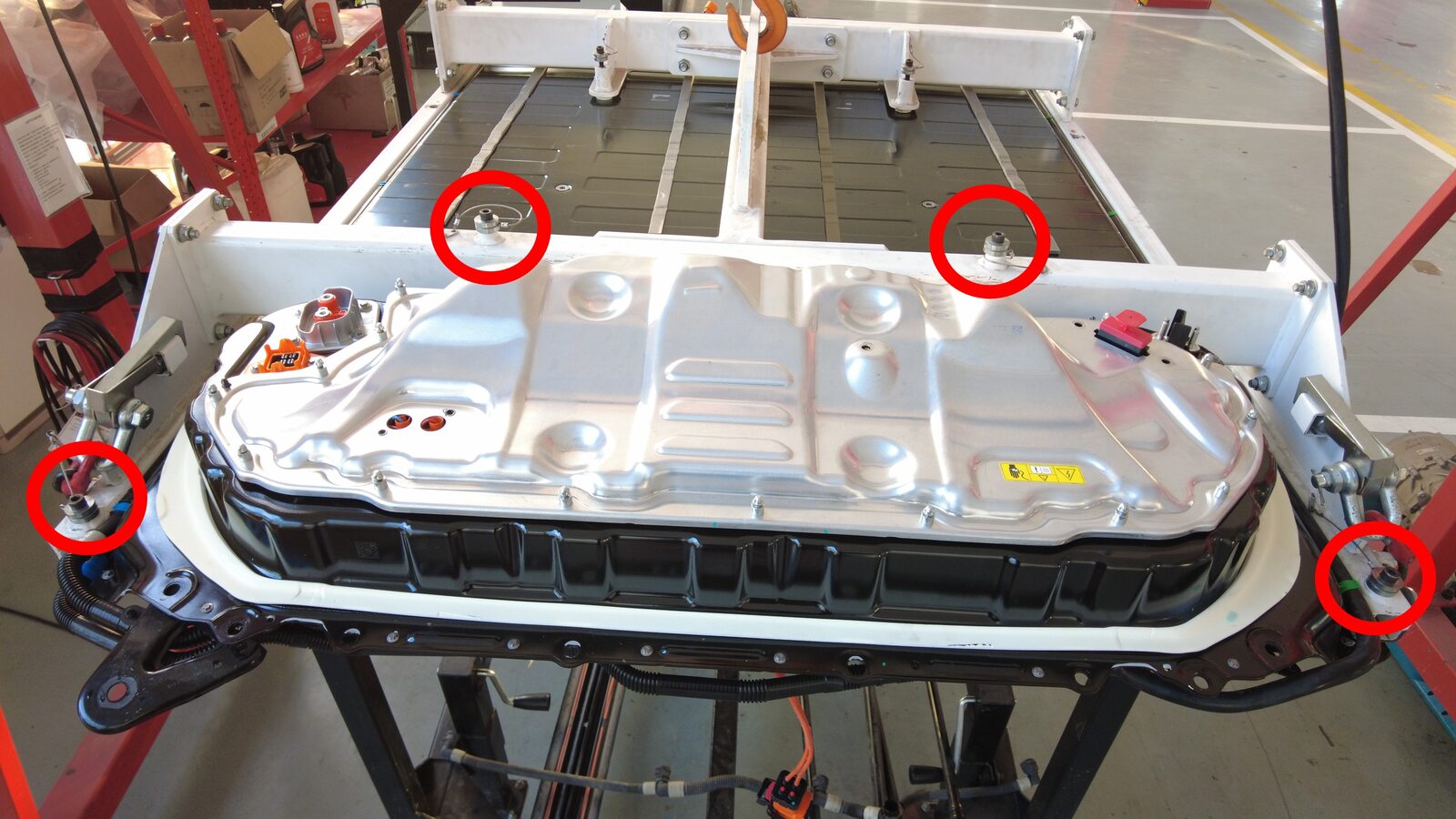 Lower H-frame onto the old HV battery and secure the H-frame to the HV battery.