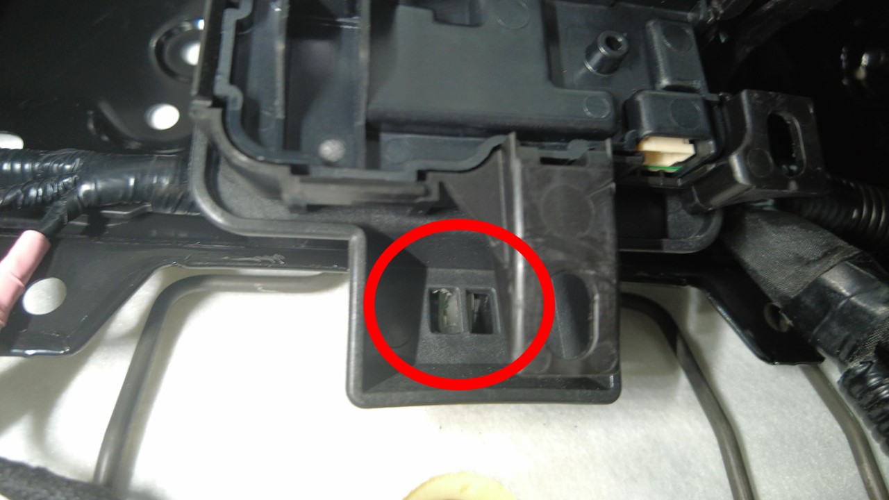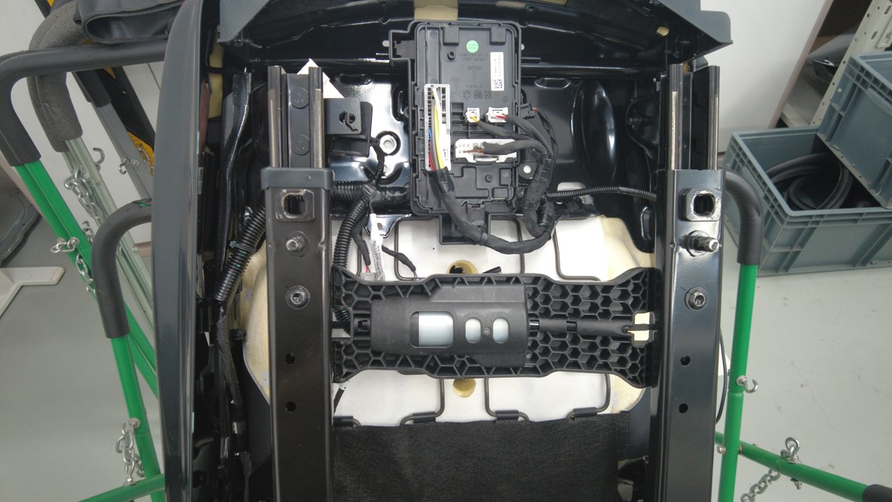 紧固锁片(2 个)和卡子,将 ECU 安装边框固定到座椅模块上。