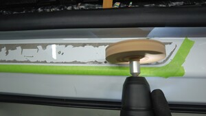 - 根据遮蔽胶带的标记,将新门槛板稳妥放置入位,然后下压,将其固定在车上。