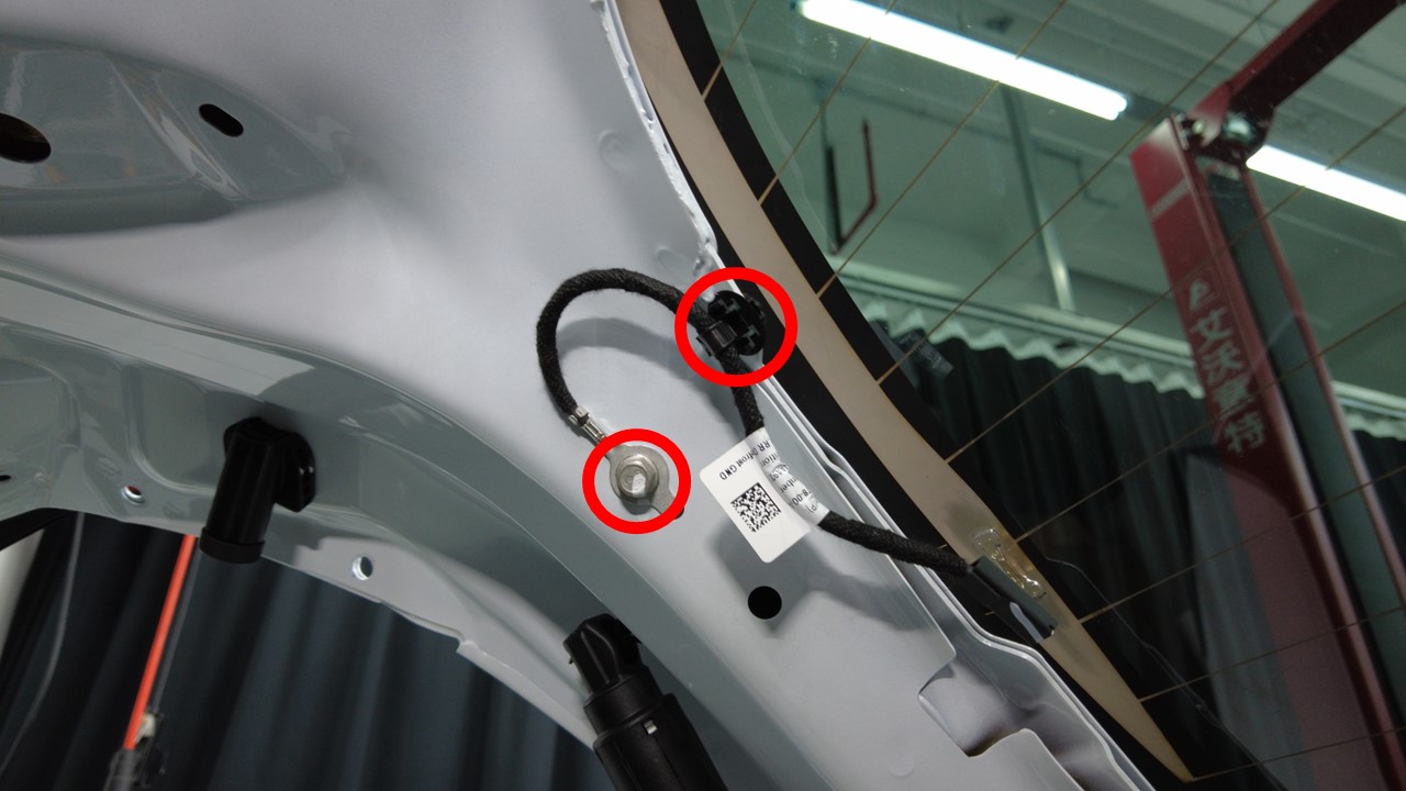 安装卡子和新的螺栓,将后除霜接地带固定到掀背尾门总成。