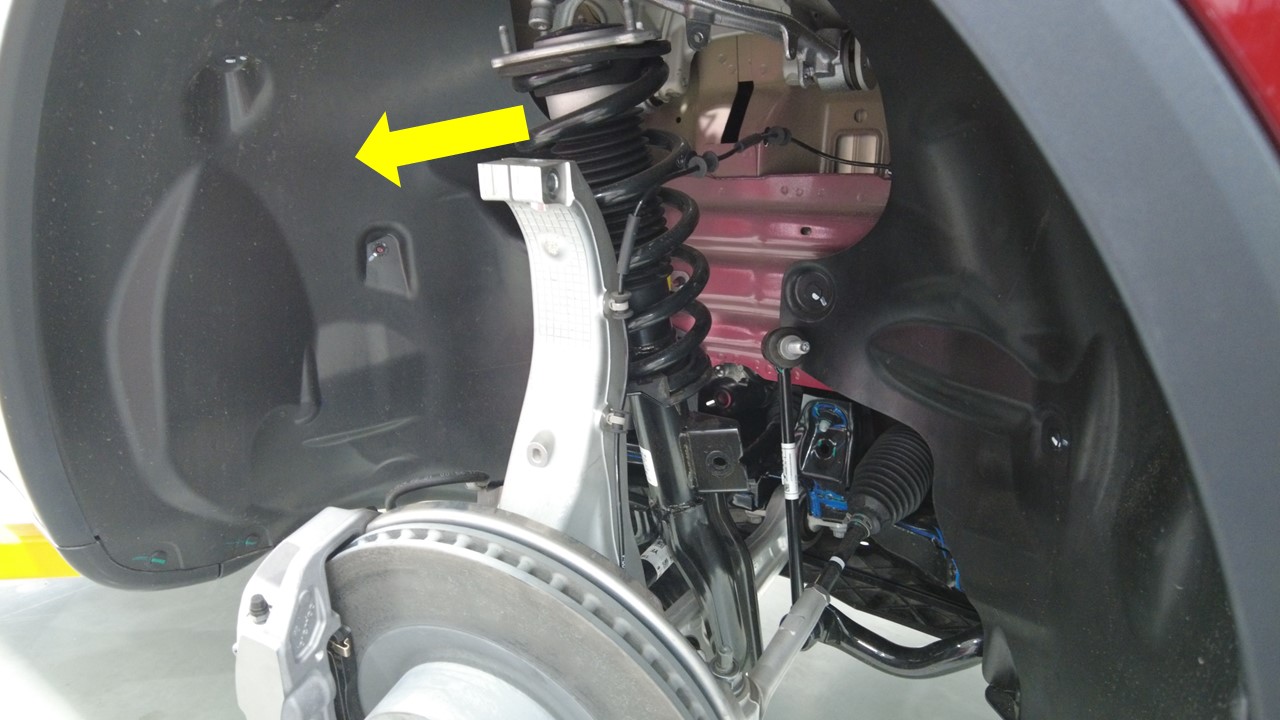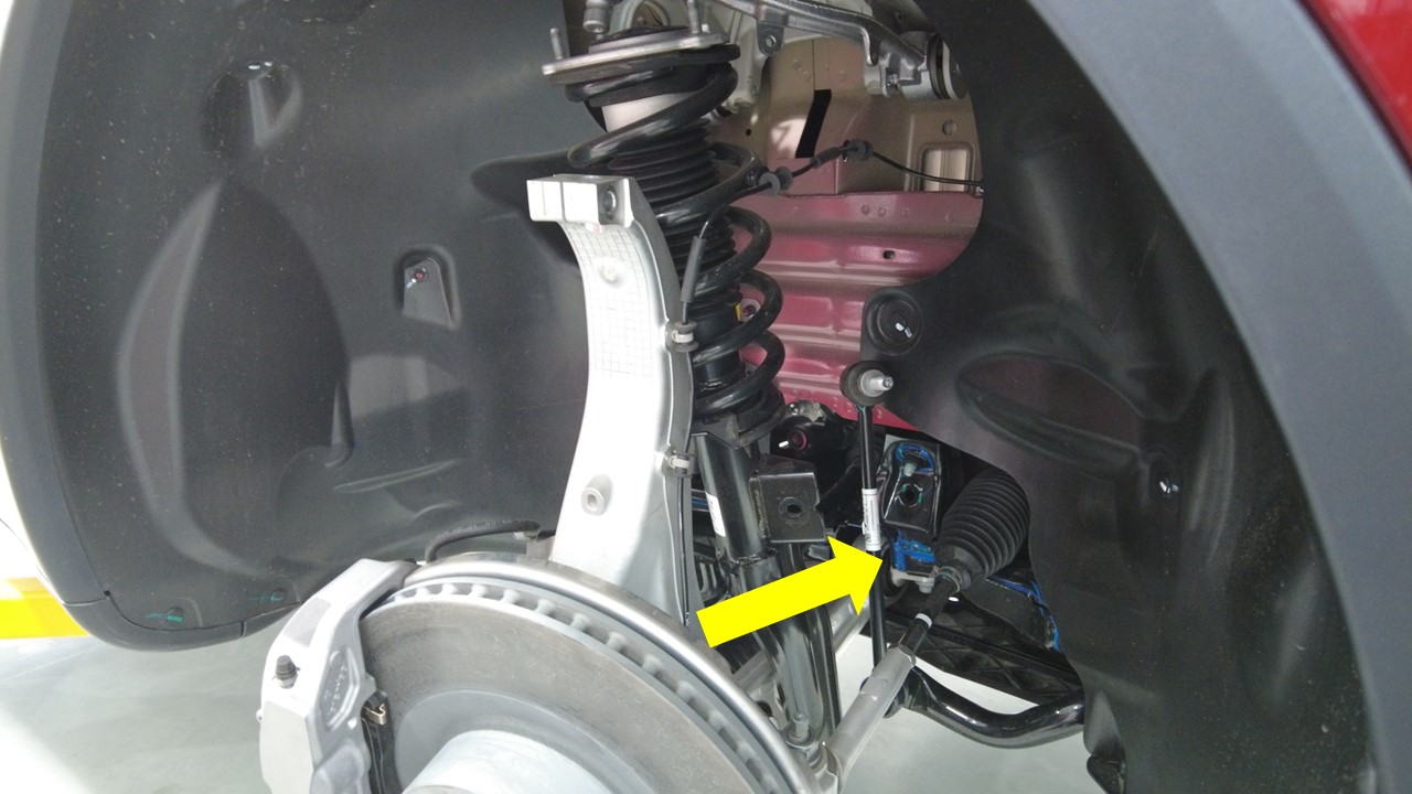 将前平衡杆末端连杆放置在右前支柱上,然后安装新的螺母,将前平衡杆末端连杆固定到右前支柱。