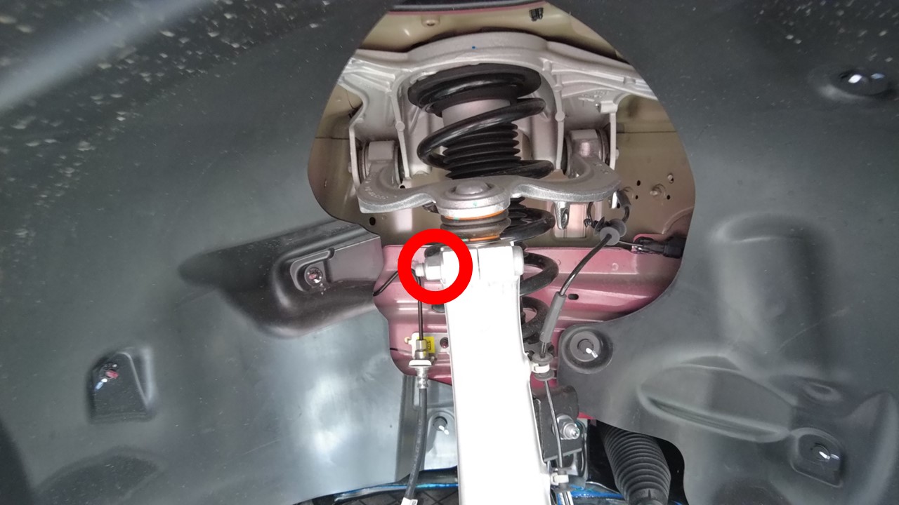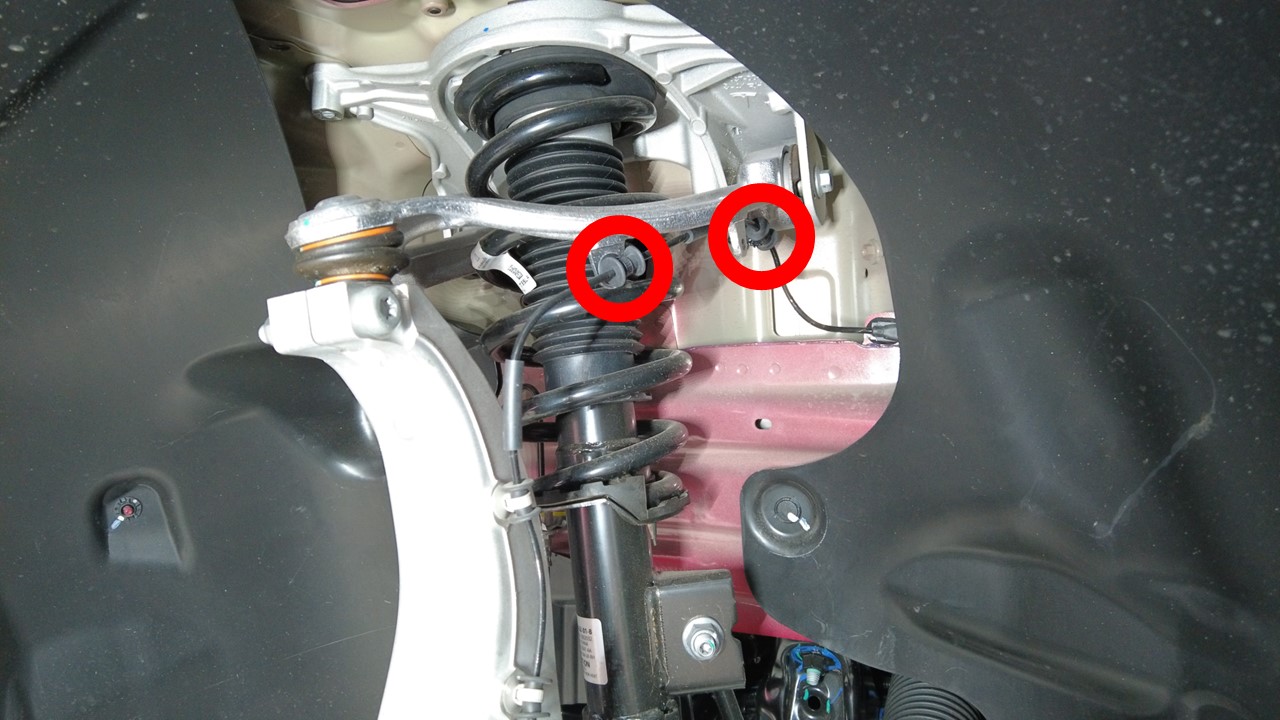 紧固将右前下方横向连杆固定到支柱的螺栓和螺母。