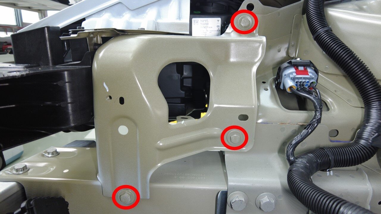 紧固将前端模块支架右侧总成固定到车身的螺栓(3 个)。