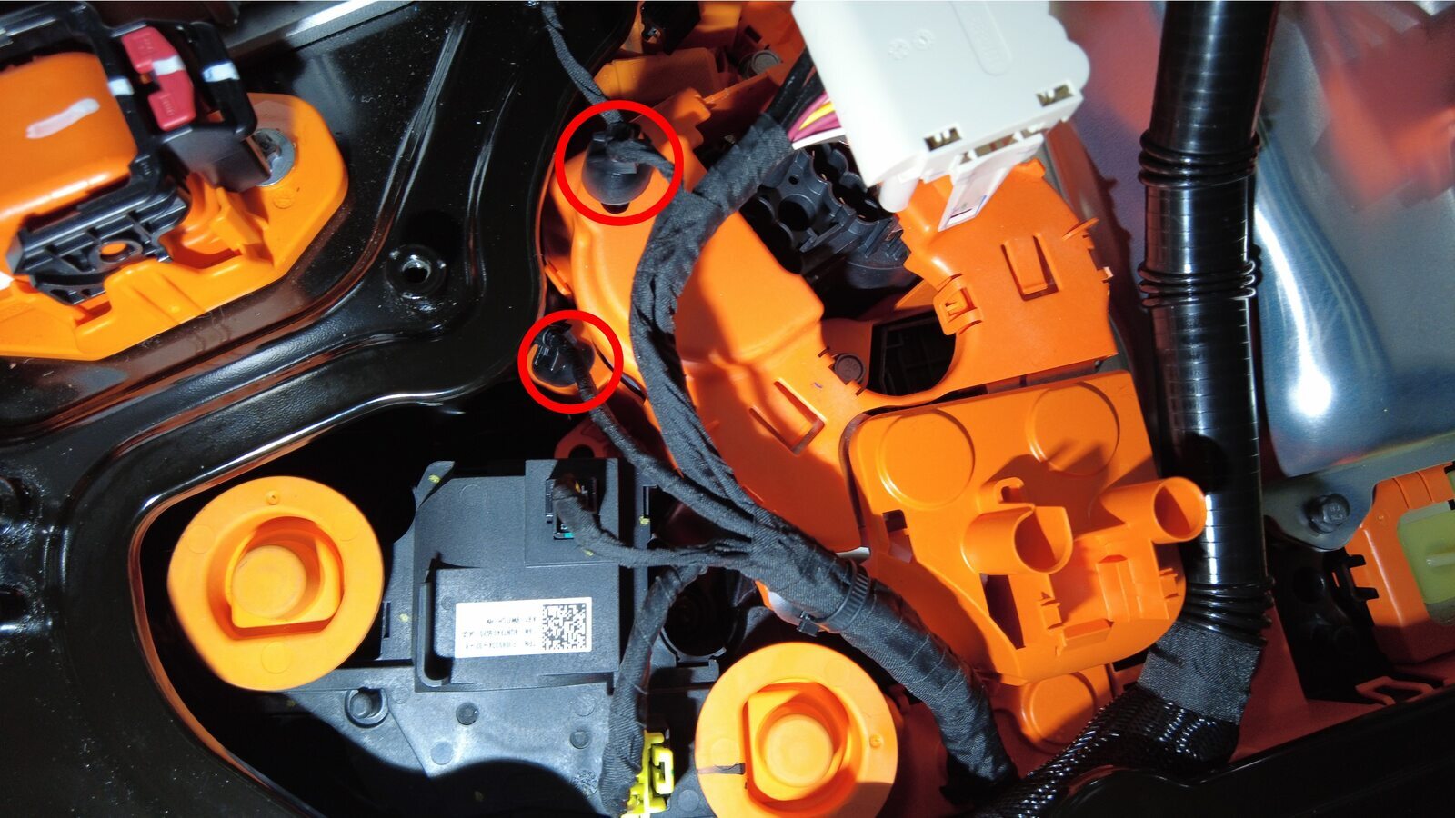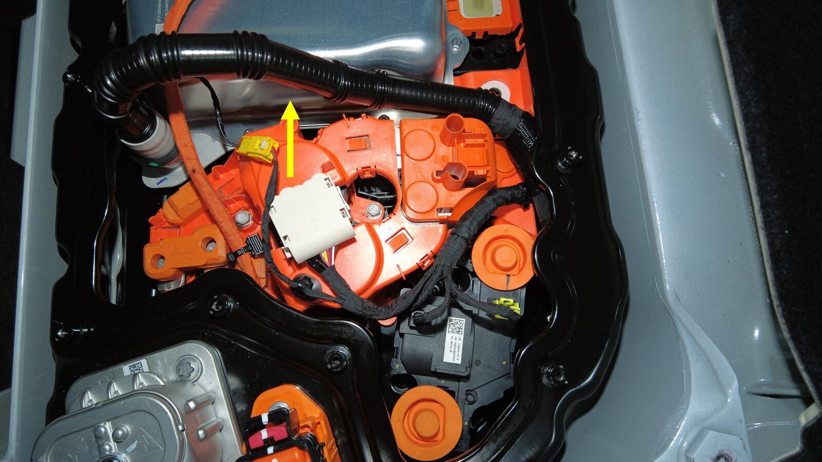 拆下快充触点开关盖板上的线束夹,将线束绕快充盖板旋转,移至一旁。