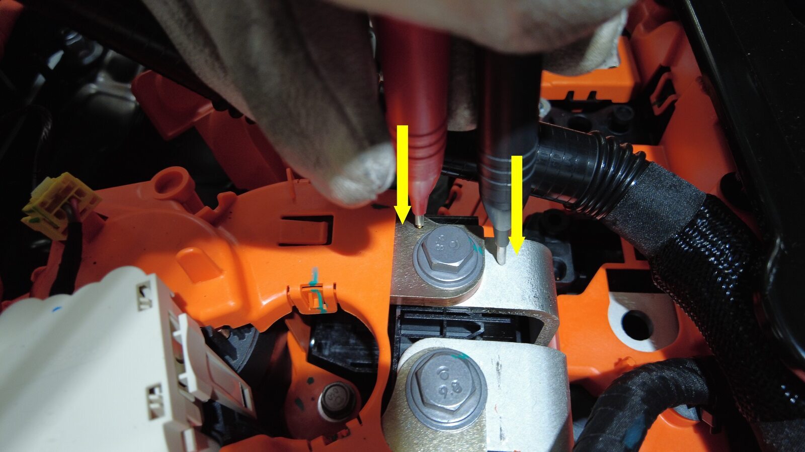 在直流输入母排总成的两个高压接头处执行 Hioki 电阻测试。