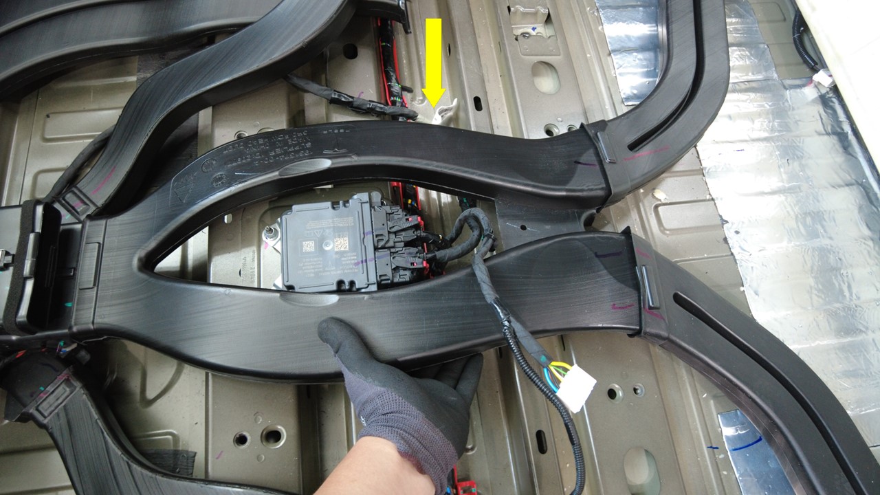 将线束夹安装到第三排顶篷风管上。