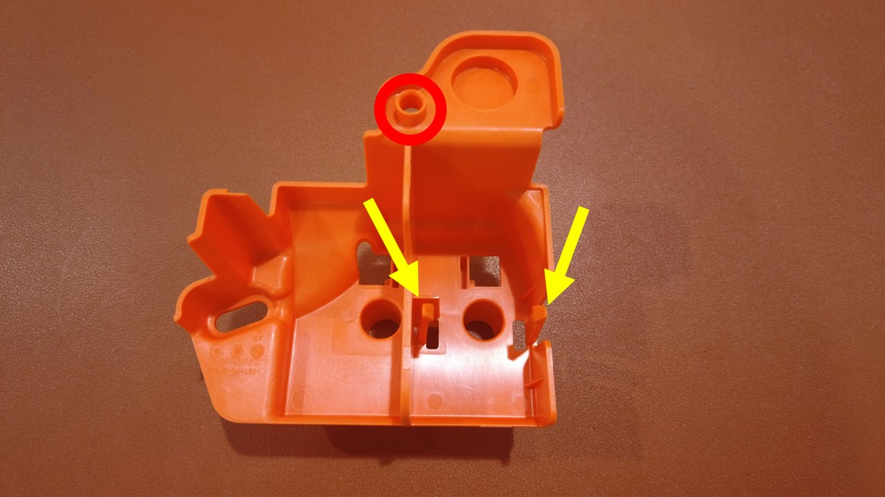 对齐锁片(2 个)和固定销,将左侧端子盖安装好。