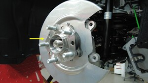 对齐左后驱动电机的半轴花键,然后将左后轮毂轴承安装到左后转向节上。