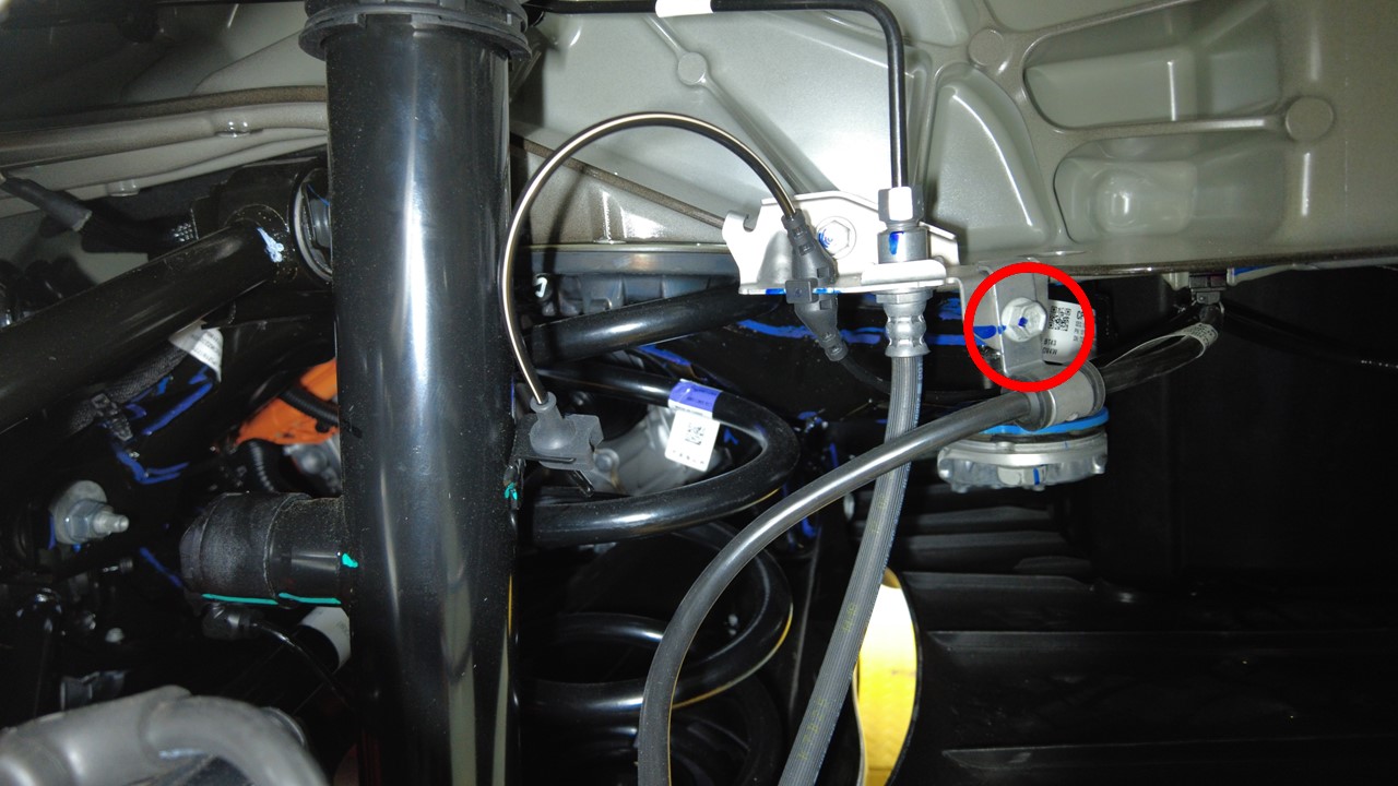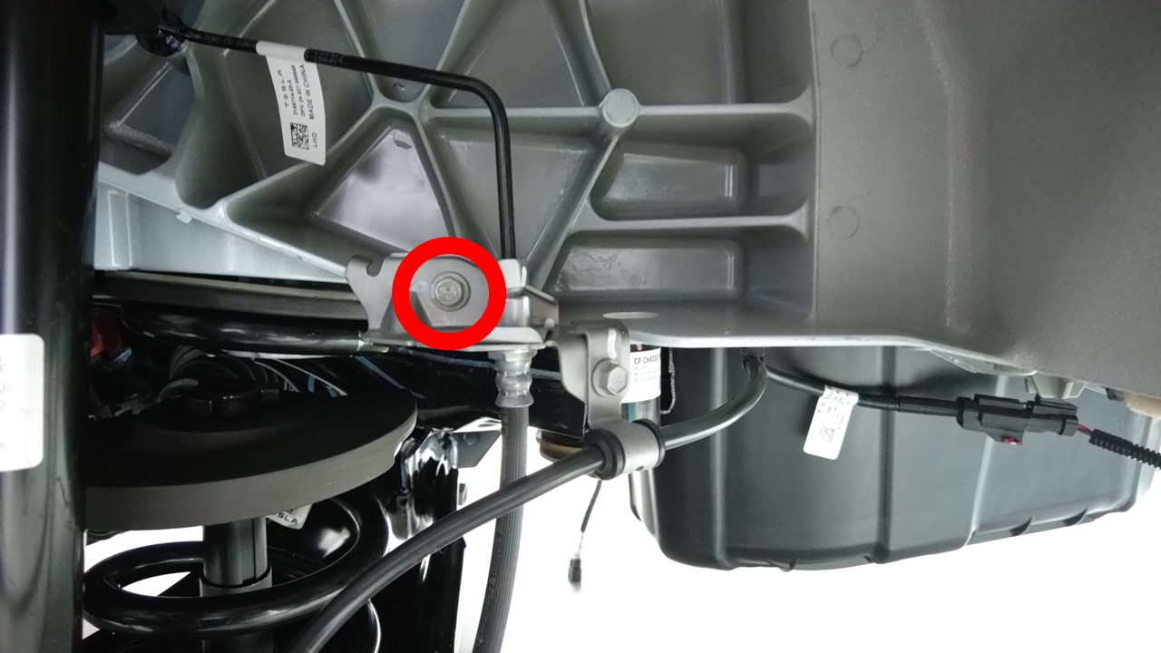 | 将左侧电子驻车制动 (EPB) 线束固定到后制动软管支架的螺栓 |