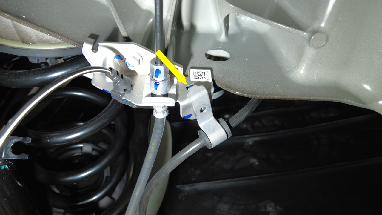 安装将左后螺旋弹簧减震器线束固定到制动软管支架的索环。