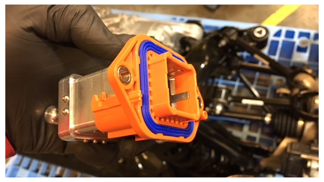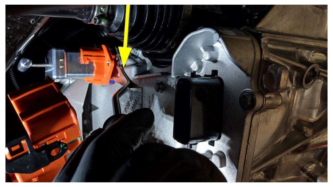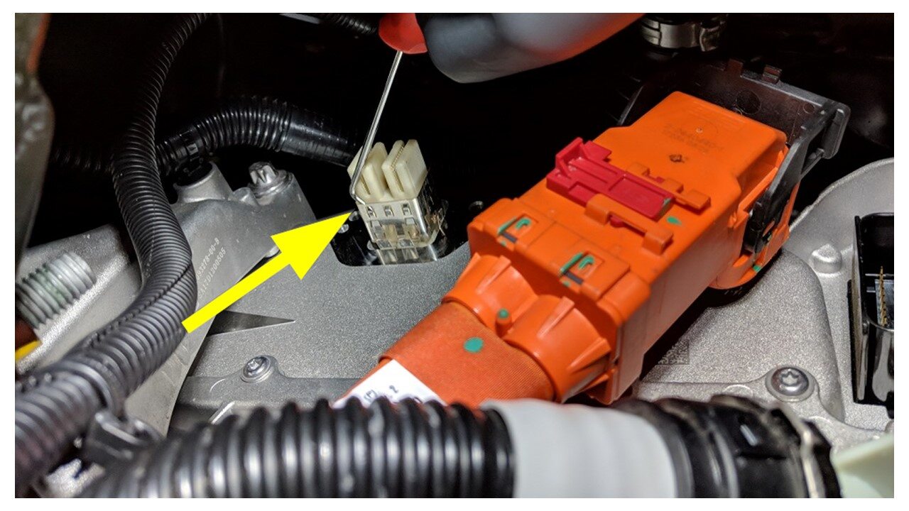 滑动释放装置,将后驱动单元至高压电池线束处的高压电池后驱动单元连接器把手从固定位置解锁。