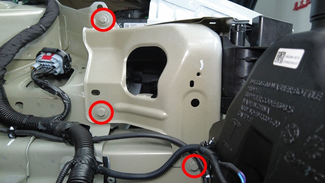 紧固将前端模块支架左侧总成固定到车身的螺栓(3 个)。