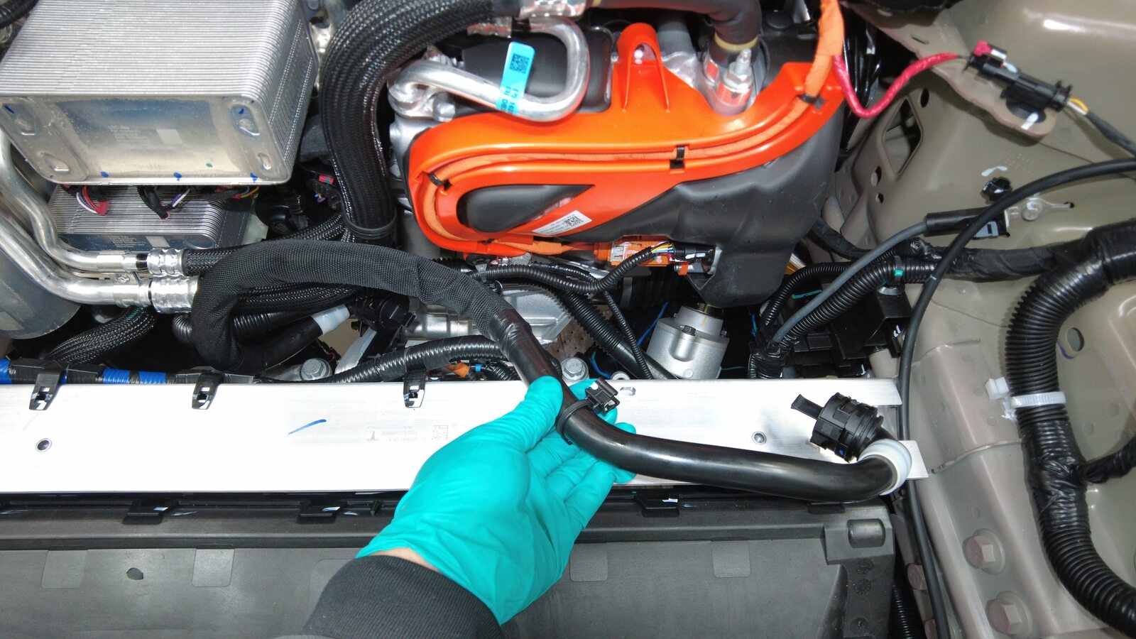- 将前驱动单元动力总成回流软管安装到车辆右侧。请参阅前驱动单元动力总成回路软管 ((拆卸和安装))。